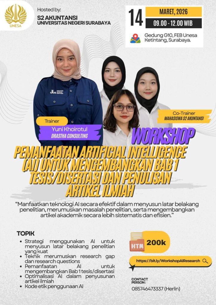 SURABAYA – Tantangan dalam menyusun karya ilmiah, mulai dari tesis hingga disertasi, seringkali berpusat pada pengembangan Bab 1 yang kuat serta perumusan research gap yang tajam. Menjawab tantangan tersebut, Program Studi S2 Akuntansi Universitas Negeri Surabaya (UNESA) bekerja sama dengan Drastha Consulting akan menyelenggarakan workshop eksklusif bertajuk “Pemanfaatan Artificial Intelligence (AI) untuk Mengembangkan Bab 1 Tesis/Disertasi dan Penulisan Artikel Ilmiah”.